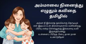 Amma Kavithai என்பது அம்மாவின் அளவிட முடியாத love-ஐ மனசுக்குள் ஆழமாக பதிய வைக்கும் ஒரு emotional tribute. இந்த கவிதைகள் அம்மாவின் sacrifice, care, silent strength—எல்லாவற்றையும் உணர வைக்கும். அவள் கேட்டுக்கொள்ளாமல் கொடுத்தது அதிகம், சொல்லாமல் தாங்கியது இன்னும் அதிகம். Amma kavithai வாசிக்கும் போது, மனசு தானாகவே soft ஆகி, gratitude naturally grow ஆகும். Words simple-ஆ இருந்தாலும், அதில் இருக்கும் feeling infinite. இது அம்மாவை praise பண்ண மட்டும் இல்ல; அவளின் presence-ஐ daily-ஆ value பண்ண சொல்லும் reminder. Amma Kavithai என்பது நினைவுகள், tears, smiles—all mixed ஆன ஒரு pure emotion, அம்மா என்ற உறவு வாழ்க்கையில் எவ்வளவு precious என்பதைக் அமைதியாக சொல்லும் ஒரு meaningful experience.