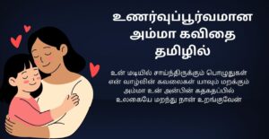 உலகம் புரியாத நேரத்திலும், அம்மாவின் கண்கள் எல்லாவற்றையும் understand பண்ணும். அவள் strength quietly work பண்ணும்; ஆனால் impact deep. இந்த கவிதைகள் childhood memories-ஐ revive பண்ணி, மனசை soft ஆக மாற்றும். Simple lines இருந்தாலும், அதில் இருக்கும் emotion priceless. Amma Kavithai என்பது படிக்க மட்டும் இல்ல; அம்மாவின் presence-ஐ மீண்டும் feel பண்ண, gratitude-ஐ மனசுக்குள் grow பண்ணும் ஒரு heartfelt experience.